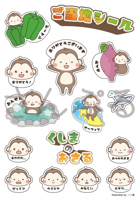 かわいく、シンプルなデザインにしました。 サルのイラストを中心に、かんしょ(おイモ)、ピーマンなどを描きました。(以前も公開していましたが、変更点があったため修正しました。)