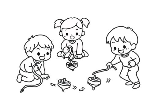 こま回しで遊ぶ幼児たち|正月あそび・伝承遊びの保育イラスト