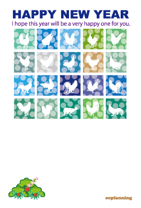 色違いのバージョンも用意しています。 鶏のシルエットがさりげなくアレンジされています。 シンプルでモダンなデザインですので幅広い方に遅れる年賀状です。 メッセージを添えてご利用ください。