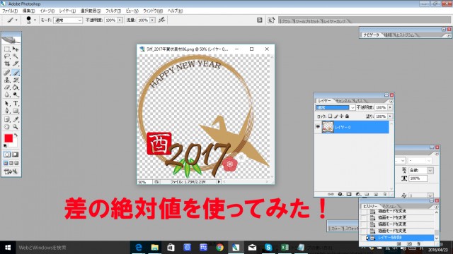 まずは、ラボ_2017年賀状素材06のレイヤーを複製させて同じ場所に配置させます。その後、「差の絶対値」をクリックしてみると、あら不思議!驚きのデザインに変身します。