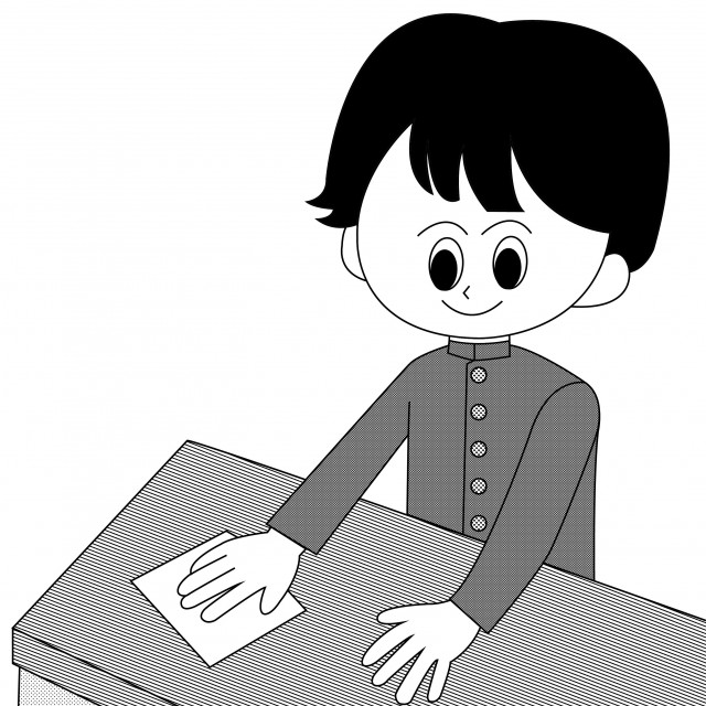 男子学生が学校の机をきれいに拭いているイラスト(白黒)に関連するまとめ