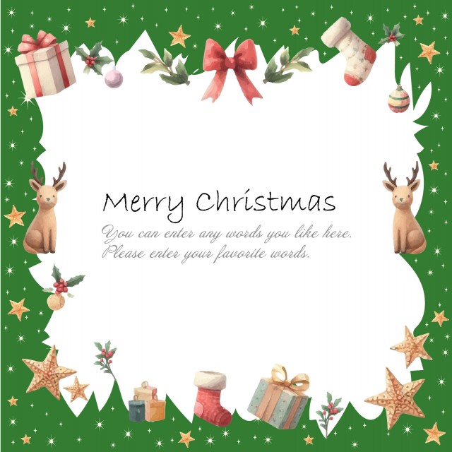 クリスマス,フレーム,可愛い,水彩,緑背景,バックグラウンド,枠,靴下,リボン,クーゲル,ツリーボール,装飾ボール,トナカイ,鹿,プレゼントボックス,箱,星,トップスター,植物,リーフ,1:1,比率,バナー,装飾,ニュアンス,アクリル画,綺麗,おしゃれ,素材,背景,飾り,イベント,ポストカード,贈り物,レター,冬,行事,12月,透過,イラスト,キラキラ,光,星型