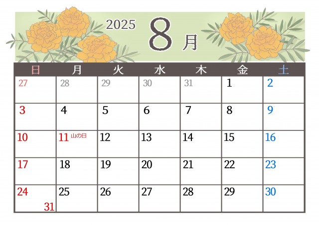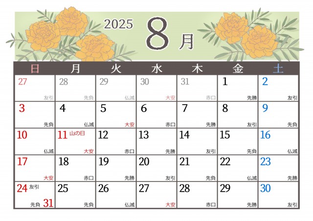 季節の花のカレンダー(六曜付きあり) 2025年8月 フレンチマリーゴールド