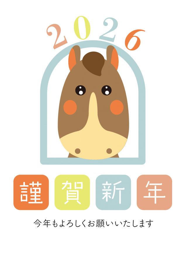年賀状 2026 カラフルな午の書の年賀状(文字ありなし)のイラストです。年賀はがきの縦サイズの…
