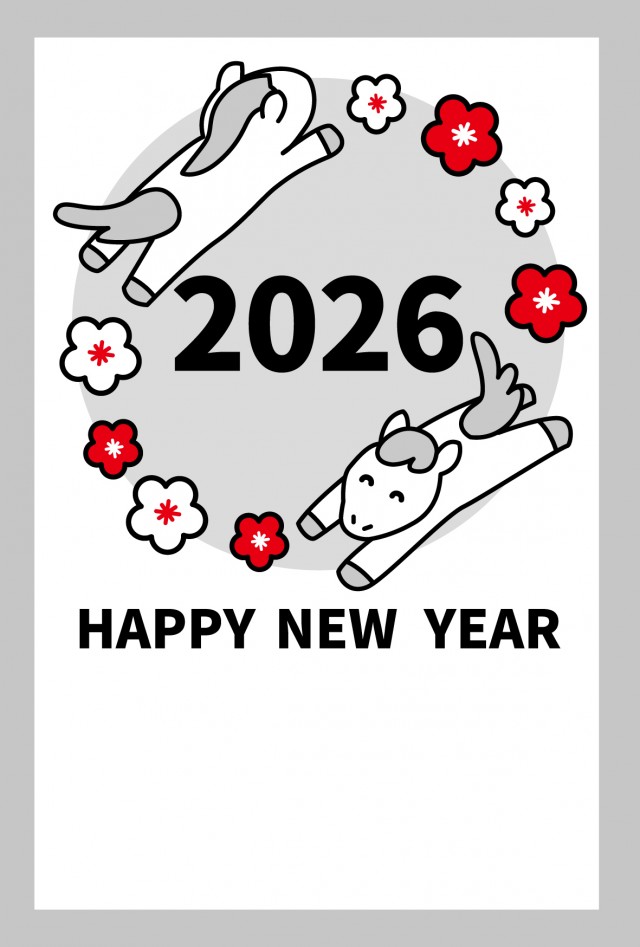 この度はご覧いただきありがとうございます!梅のフレームと走る二頭の白い馬2026年年賀状です。シ…