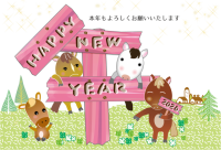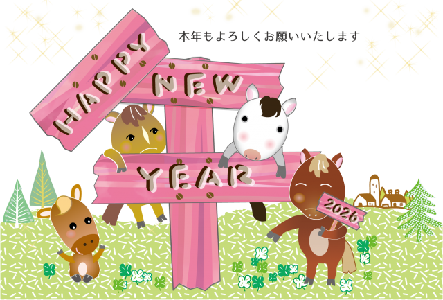 かわいい年賀状 草原の「牛」看板に集うポニーに関連するまとめ
