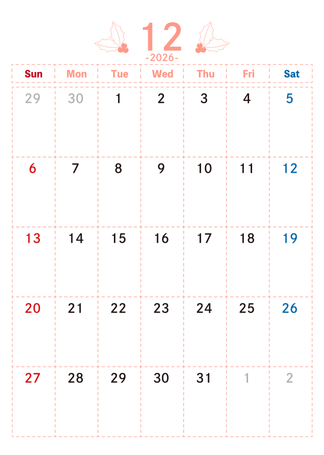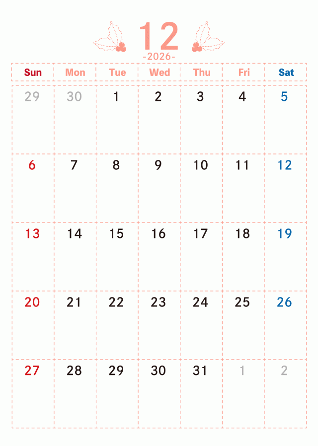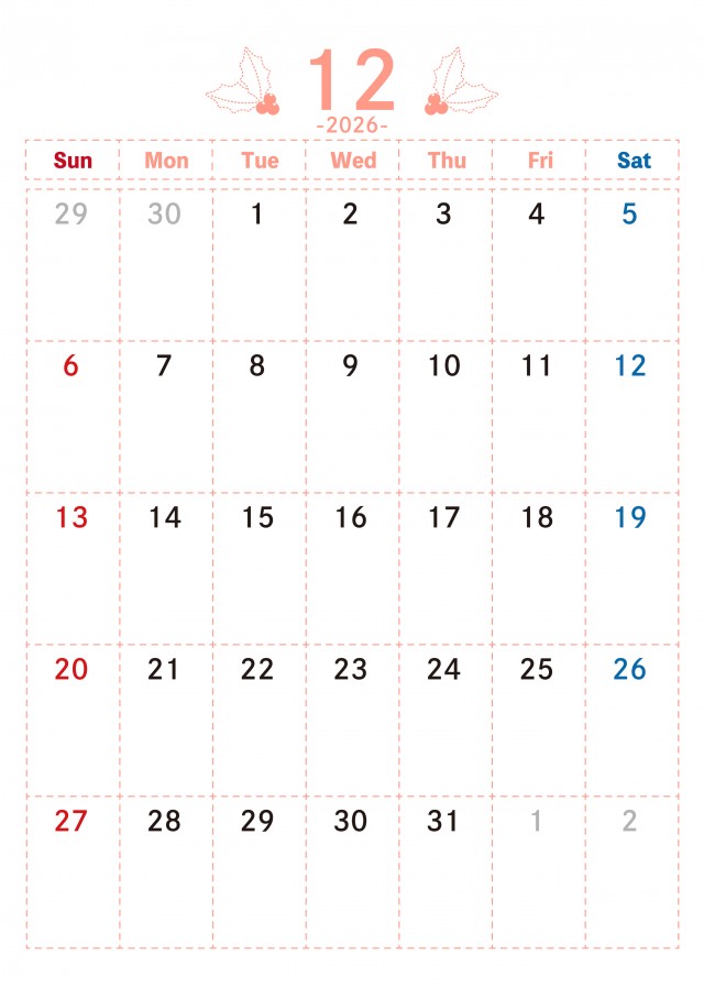 ドット線柄 2026年12月カレンダー クリスマスのセイヨウヒイラギ