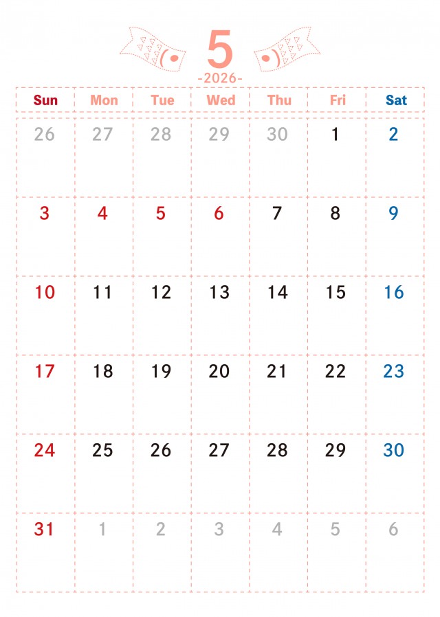 「ドット線柄 2026年5月カレンダー こどもの日の鯉のぼり」の無料イラスト素材・雛形素材、無料で使える「ドット線柄 2026年5月カレンダー こどもの日の鯉のぼり」を簡単ダウンロード出来ます。 素材ラボは「無料 イラスト」サイトとなり沢山の無料で使える素材がご利用頂けます。 「ドット線柄 2026年5月カレンダー こどもの日の鯉のぼり」の投稿は「おーとみーるこ」様よりご利用ありがとうございます。 ご投稿頂きました沢山の「カレンダー」、「月めくり」、「ドット」より探す。 「ドット線柄 2026年5月カレンダー こどもの日の鯉のぼり」関連の無料イラスト素材・雛形素材を投稿する事でポイントが獲得出来たり無料で「カレンダー」、「月めくり」、「ドット」関連の素材等を利用する、事が可能となります。 利用をする方は「会員登録(無料)」より「カレンダー」関連を投稿で出来る方は「イラストレーター様登録」よりご登録くださいませ。 「カレンダー」は日々イラストレーター様より最新の無料イラストが投稿されております。