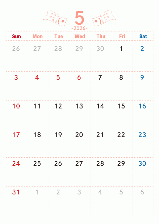 ドット線柄 2026年5月カレンダー こどもの日の鯉のぼり