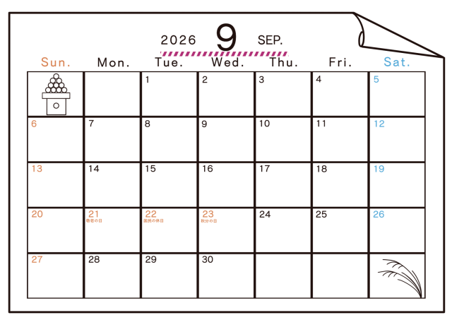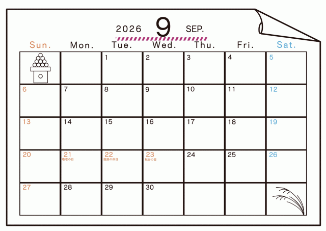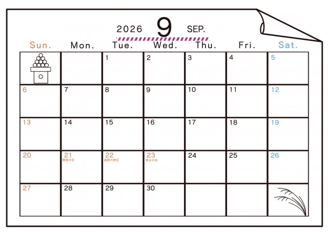 2026年9月 角がまるまった紙と12パターンの柄(季節のワンポイントつき)に関連するまとめ