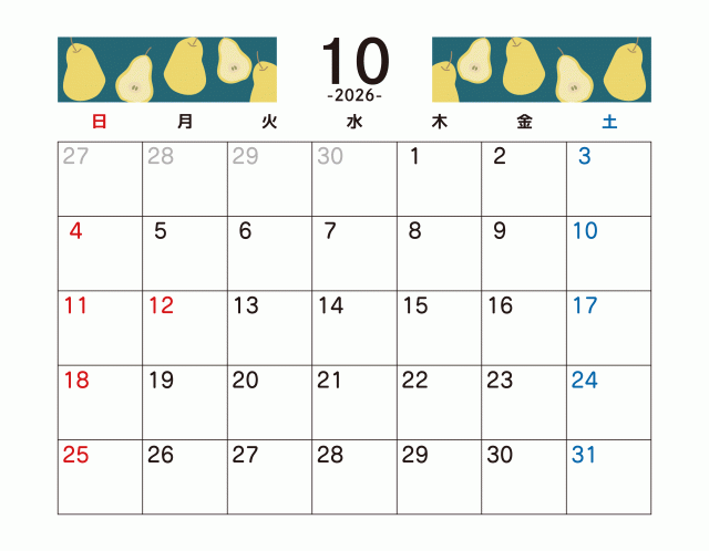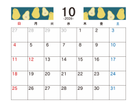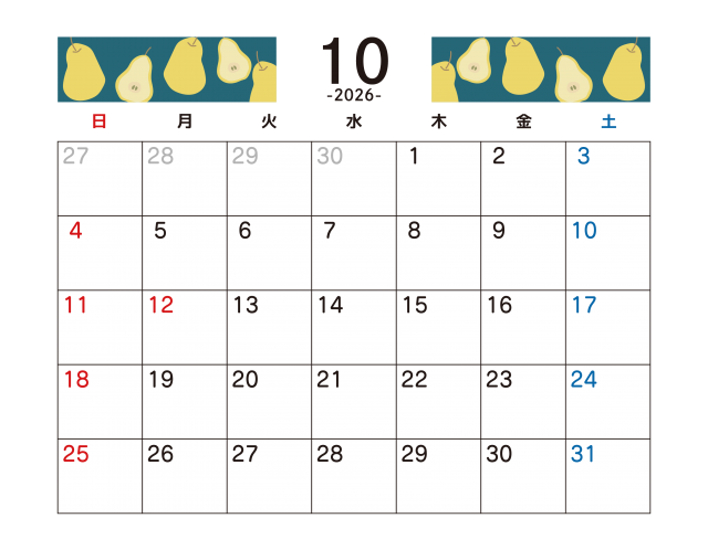 フルーツ柄 2026年10月カレンダー 洋ナシ