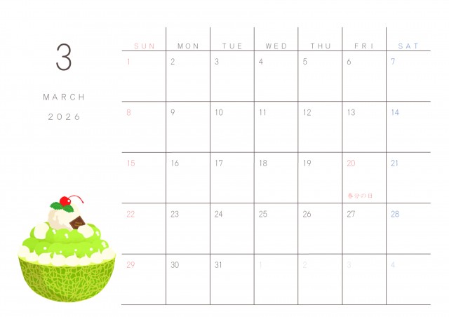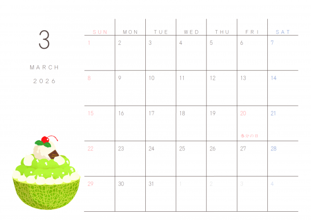 「季節の美味しい洋菓子_2026年3月カレンダー_A4サイズ」の無料イラスト素材・雛形素材、無料で使える「季節の美味しい洋菓子_2026年3月カレンダー_A4サイズ」を簡単ダウンロード出来ます。 素材ラボは「無料 イラスト」サイトとなり沢山の無料で使える素材がご利用頂けます。 「季節の美味しい洋菓子_2026年3月カレンダー_A4サイズ」の投稿は「ま め」様よりご利用ありがとうございます。 ご投稿頂きました沢山の「2026年」、「令和8年」、「3月」より探す。 「季節の美味しい洋菓子_2026年3月カレンダー_A4サイズ」関連の無料イラスト素材・雛形素材を投稿する事でポイントが獲得出来たり無料で「2026年」、「令和8年」、「3月」関連の素材等を利用する、事が可能となります。 利用をする方は「会員登録(無料)」より「カレンダー」関連を投稿で出来る方は「イラストレーター様登録」よりご登録くださいませ。 「カレンダー」は日々イラストレーター様より最新の無料イラストが投稿されております。