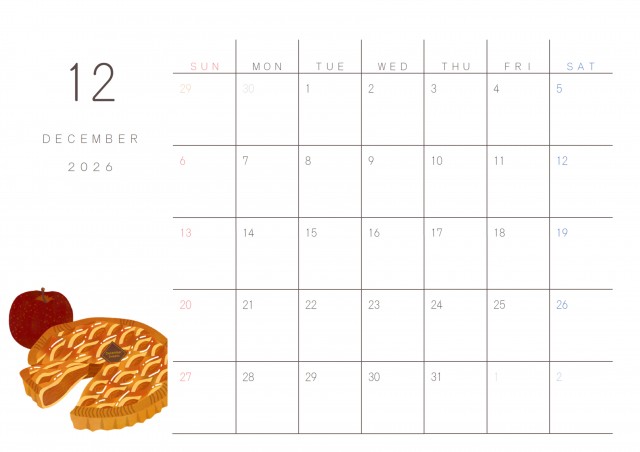 「季節の美味しい洋菓子_2026年12月カレンダー_A4サイズ」の無料イラスト素材・雛形素材、無料で使える「季節の美味しい洋菓子_2026年12月カレンダー_A4サイズ」を簡単ダウンロード出来ます。 素材ラボは「無料 イラスト」サイトとなり沢山の無料で使える素材がご利用頂けます。 「季節の美味しい洋菓子_2026年12月カレンダー_A4サイズ」の投稿は「ま め」様よりご利用ありがとうございます。 ご投稿頂きました沢山の「2026年」、「令和8年」、「12月」より探す。 「季節の美味しい洋菓子_2026年12月カレンダー_A4サイズ」関連の無料イラスト素材・雛形素材を投稿する事でポイントが獲得出来たり無料で「2026年」、「令和8年」、「12月」関連の素材等を利用する、事が可能となります。 利用をする方は「会員登録(無料)」より「カレンダー」関連を投稿で出来る方は「イラストレーター様登録」よりご登録くださいませ。 「カレンダー」は日々イラストレーター様より最新の無料イラストが投稿されております。