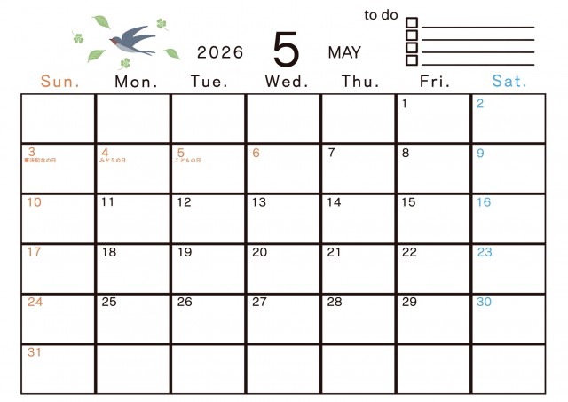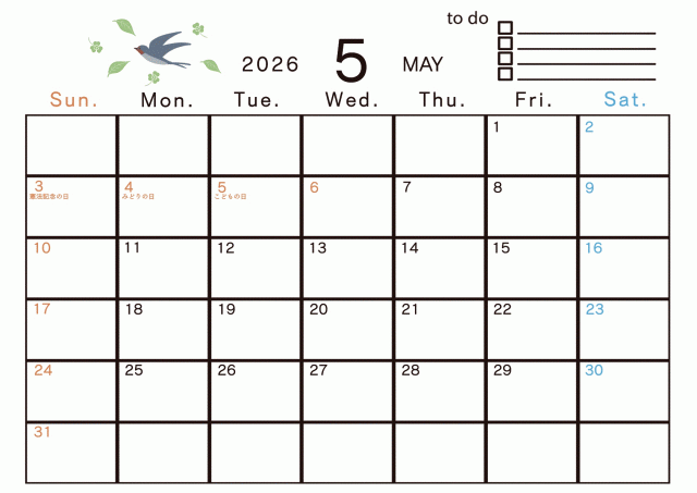 「2026年 5月 季節のイラストのあるカレンダー」の無料イラスト素材・雛形素材、無料で使える「2026年 5月 季節のイラストのあるカレンダー」を簡単ダウンロード出来ます。 素材ラボは「無料 イラスト」サイトとなり沢山の無料で使える素材がご利用頂けます。 「2026年 5月 季節のイラストのあるカレンダー」の投稿は「RinM」様よりご利用ありがとうございます。 ご投稿頂きました沢山の「2026年」、「5月」、「カレンダー」より探す。 「2026年 5月 季節のイラストのあるカレンダー」関連の無料イラスト素材・雛形素材を投稿する事でポイントが獲得出来たり無料で「2026年」、「5月」、「カレンダー」関連の素材等を利用する、事が可能となります。 利用をする方は「会員登録(無料)」より「カレンダー」関連を投稿で出来る方は「イラストレーター様登録」よりご登録くださいませ。 「カレンダー」は日々イラストレーター様より最新の無料イラストが投稿されております。
