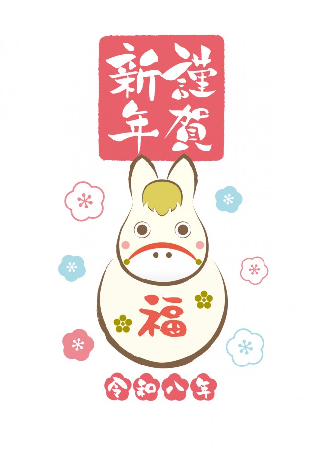 2026年午年の手書き筆文字「謹賀新年」と福だるま風の白馬の和風で可愛い年賀状に関連するまとめ