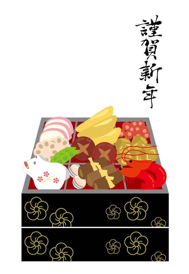 午年の2026年の年賀状素材です。おせちのデザインです。