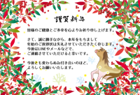 お正月にふさわしい縁起物と、馬をガーランドにつなげて、一面に配置した楽しいデザインです。文章なし…