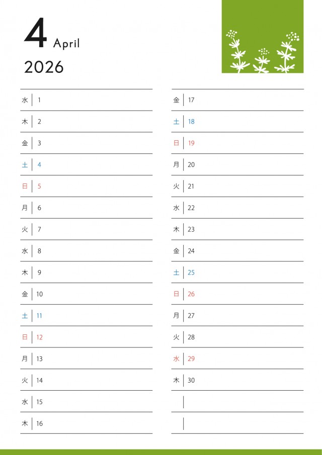 2026年に対応した一ヵ月用のカレンダーです。一日一行×二段のデザインです。297×210のA4…