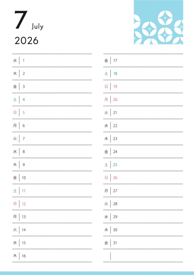 花のワンポイントの月間カレンダー(2026年・7月)