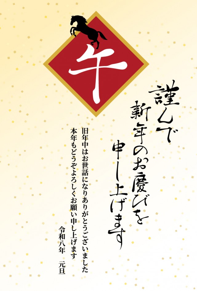 「2026年午年 年賀状 午の文字を飛び越えようとする馬」の無料イラスト素材・雛形素材、無料で使える「2026年午年 年賀状 午の文字を飛び越えようとする馬」を簡単ダウンロード出来ます。 素材ラボは「無料 イラスト」サイトとなり沢山の無料で使える素材がご利用頂けます。 「2026年午年 年賀状 午の文字を飛び越えようとする馬」の投稿は「shinya」様よりご利用ありがとうございます。 ご投稿頂きました沢山の「年賀状」、「午年」、「午」より探す。 「2026年午年 年賀状 午の文字を飛び越えようとする馬」関連の無料イラスト素材・雛形素材を投稿する事でポイントが獲得出来たり無料で「年賀状」、「午年」、「午」関連の素材等を利用する、事が可能となります。 利用をする方は「会員登録(無料)」より「年賀状・はがき」関連を投稿で出来る方は「イラストレーター様登録」よりご登録くださいませ。 「年賀状・はがき」は日々イラストレーター様より最新の無料イラストが投稿されております。