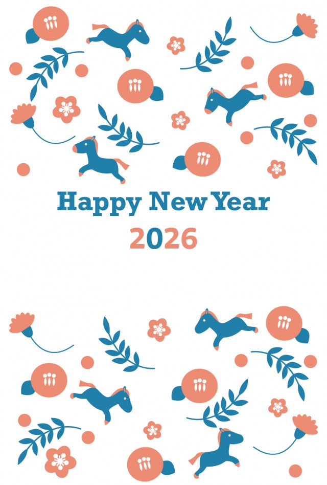 赤色の郷土玩具八幡馬のイラストが描かれています。2026年の午年の年賀状としてご利用いただけます…