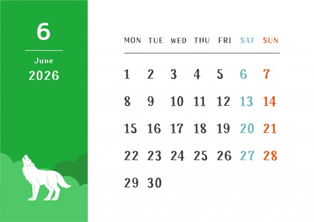 動物のシルエットと月間カレンダー(2026年・6月)
