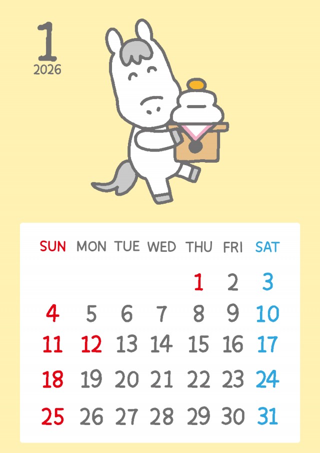 「白い馬の2026年1月カレンダー」の無料イラスト素材・雛形素材、無料で使える「白い馬の2026年1月カレンダー」を簡単ダウンロード出来ます。 素材ラボは「無料 イラスト」サイトとなり沢山の無料で使える素材がご利用頂けます。 「白い馬の2026年1月カレンダー」の投稿は「マメハル」様よりご利用ありがとうございます。 ご投稿頂きました沢山の「シンプル」、「カレンダー」、「2026年」より探す。 「白い馬の2026年1月カレンダー」関連の無料イラスト素材・雛形素材を投稿する事でポイントが獲得出来たり無料で「シンプル」、「カレンダー」、「2026年」関連の素材等を利用する、事が可能となります。 利用をする方は「会員登録(無料)」より「カレンダー」関連を投稿で出来る方は「イラストレーター様登録」よりご登録くださいませ。 「カレンダー」は日々イラストレーター様より最新の無料イラストが投稿されております。