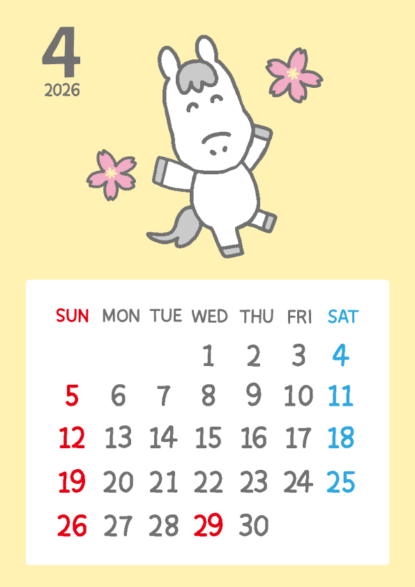 「白い馬の2026年4月カレンダー」の無料イラスト素材・雛形素材、無料で使える「白い馬の2026年4月カレンダー」を簡単ダウンロード出来ます。 素材ラボは「無料 イラスト」サイトとなり沢山の無料で使える素材がご利用頂けます。 「白い馬の2026年4月カレンダー」の投稿は「マメハル」様よりご利用ありがとうございます。 ご投稿頂きました沢山の「シンプル」、「カレンダー」、「2026年」より探す。 「白い馬の2026年4月カレンダー」関連の無料イラスト素材・雛形素材を投稿する事でポイントが獲得出来たり無料で「シンプル」、「カレンダー」、「2026年」関連の素材等を利用する、事が可能となります。 利用をする方は「会員登録(無料)」より「カレンダー」関連を投稿で出来る方は「イラストレーター様登録」よりご登録くださいませ。 「カレンダー」は日々イラストレーター様より最新の無料イラストが投稿されております。