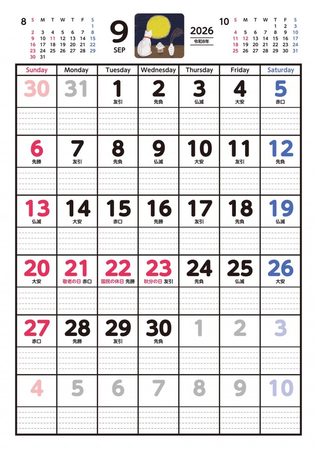 「スケジュールが書き込める可愛い猫のカレンダー 2026年9月」の無料イラスト素材・雛形素材、無料で使える「スケジュールが書き込める可愛い猫のカレンダー 2026年9月」を簡単ダウンロード出来ます。 素材ラボは「無料 イラスト」サイトとなり沢山の無料で使える素材がご利用頂けます。 「スケジュールが書き込める可愛い猫のカレンダー 2026年9月」の投稿は「しろちび」様よりご利用ありがとうございます。 ご投稿頂きました沢山の「猫」、「お月様」、「月見」より探す。 「スケジュールが書き込める可愛い猫のカレンダー 2026年9月」関連の無料イラスト素材・雛形素材を投稿する事でポイントが獲得出来たり無料で「猫」、「お月様」、「月見」関連の素材等を利用する、事が可能となります。 利用をする方は「会員登録(無料)」より「カレンダー」関連を投稿で出来る方は「イラストレーター様登録」よりご登録くださいませ。 「カレンダー」は日々イラストレーター様より最新の無料イラストが投稿されております。