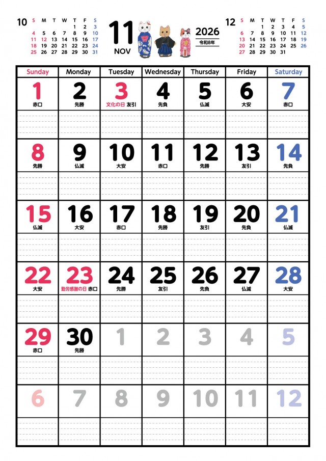 スケジュールが書き込める可愛い猫のカレンダー 2026年11月