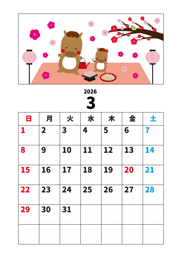 3_2026年月間カレンダー_3月・ひなまつりと馬