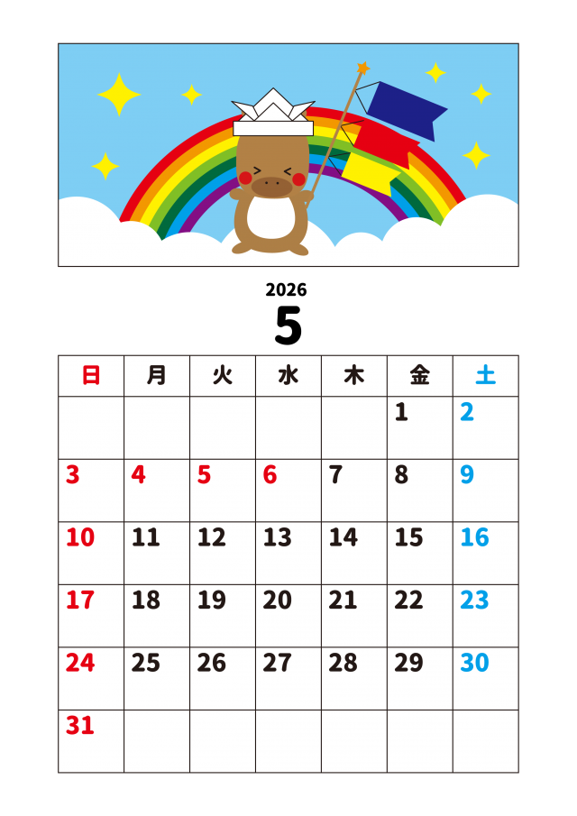 「5_2026年月間カレンダー_5月・こどもの日と馬」の無料イラスト素材・雛形素材、無料で使える「5_2026年月間カレンダー_5月・こどもの日と馬」を簡単ダウンロード出来ます。 素材ラボは「無料 イラスト」サイトとなり沢山の無料で使える素材がご利用頂けます。 「5_2026年月間カレンダー_5月・こどもの日と馬」の投稿は「oto」様よりご利用ありがとうございます。 ご投稿頂きました沢山の「カレンダー」、「2026年」、「午年」より探す。 「5_2026年月間カレンダー_5月・こどもの日と馬」関連の無料イラスト素材・雛形素材を投稿する事でポイントが獲得出来たり無料で「カレンダー」、「2026年」、「午年」関連の素材等を利用する、事が可能となります。 利用をする方は「会員登録(無料)」より「カレンダー」関連を投稿で出来る方は「イラストレーター様登録」よりご登録くださいませ。 「カレンダー」は日々イラストレーター様より最新の無料イラストが投稿されております。