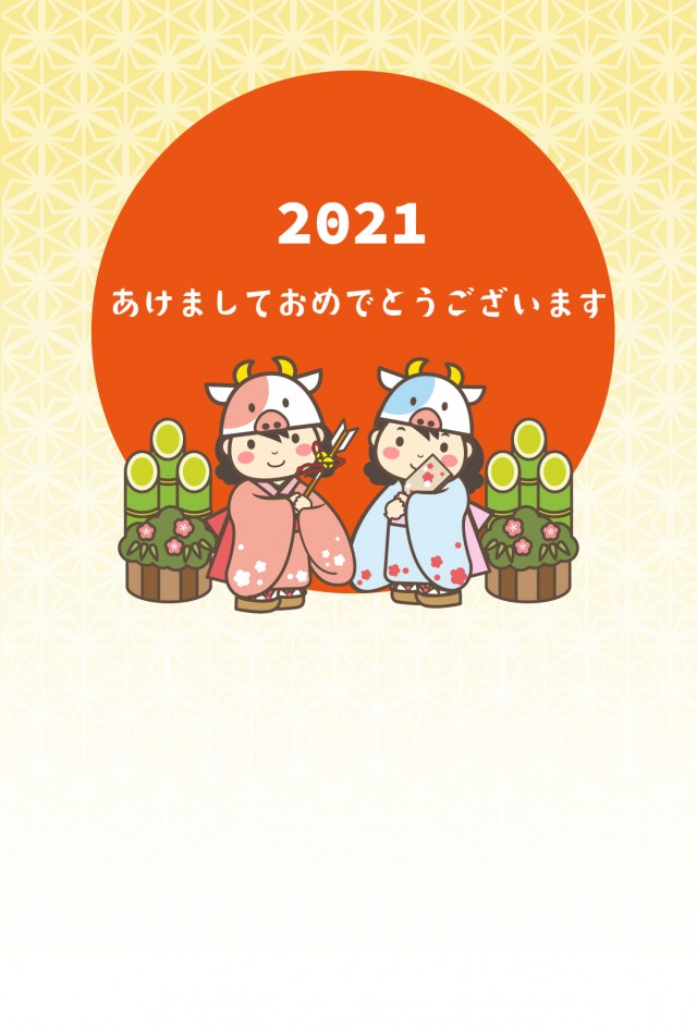 2021年 年賀状 牛の顔型の帽子をかぶる和服姿の二人の女の子に関連するまとめ