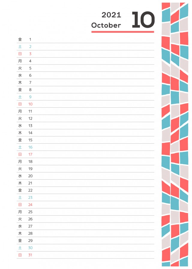 北欧風パターンの月間カレンダー・一日一行タイプ(2021年・10月)