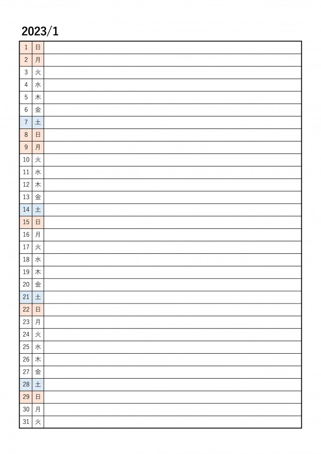 1月:2023年月間カレンダー:シンプル一行日記